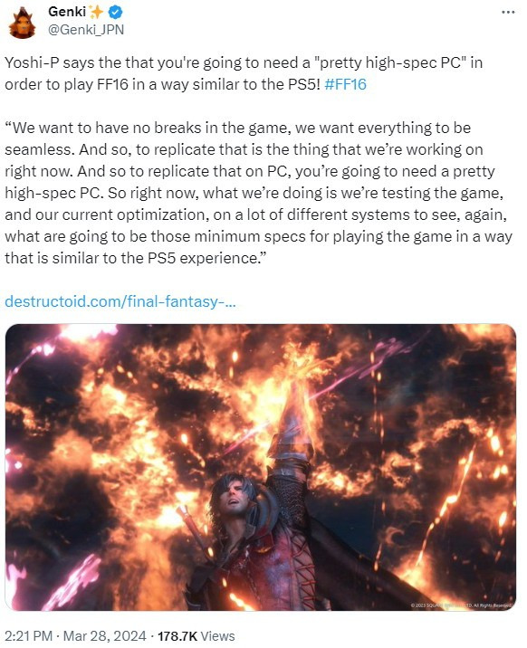 《最终幻想16》PC版的更多细节在不断曝光。虽然目前官方还未公布PC配置需求,但吉田直树表示需要一台高配置PC机,才能流畅运行《最终幻想16》。