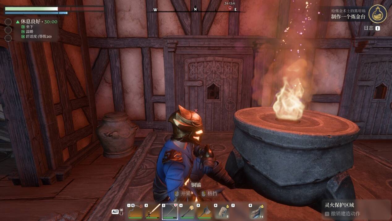 开局建家任务往西北处跑,有个提示需要抓钩的地方,不用理会,把平台的木栏杆砍掉然后直接加速跑跳可以跳到对面,上面有两个怪一个远程一个狗,把狗拉出来打然后近战a远程怪就可以,敲掉明显的两个炸药桶可以看到坑底有宝箱,开宝箱刷个能用的装备就基本过渡前期了。(救了铁匠后找他强化武器)