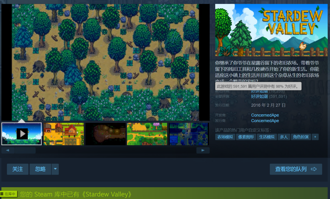 星露谷物语,开放式乡村模拟经营类游戏之典范,从2016年发售至今一直保持的95%以上的好评率,在steam平台上“好评如潮”的游戏里也称的上是独树一帜。