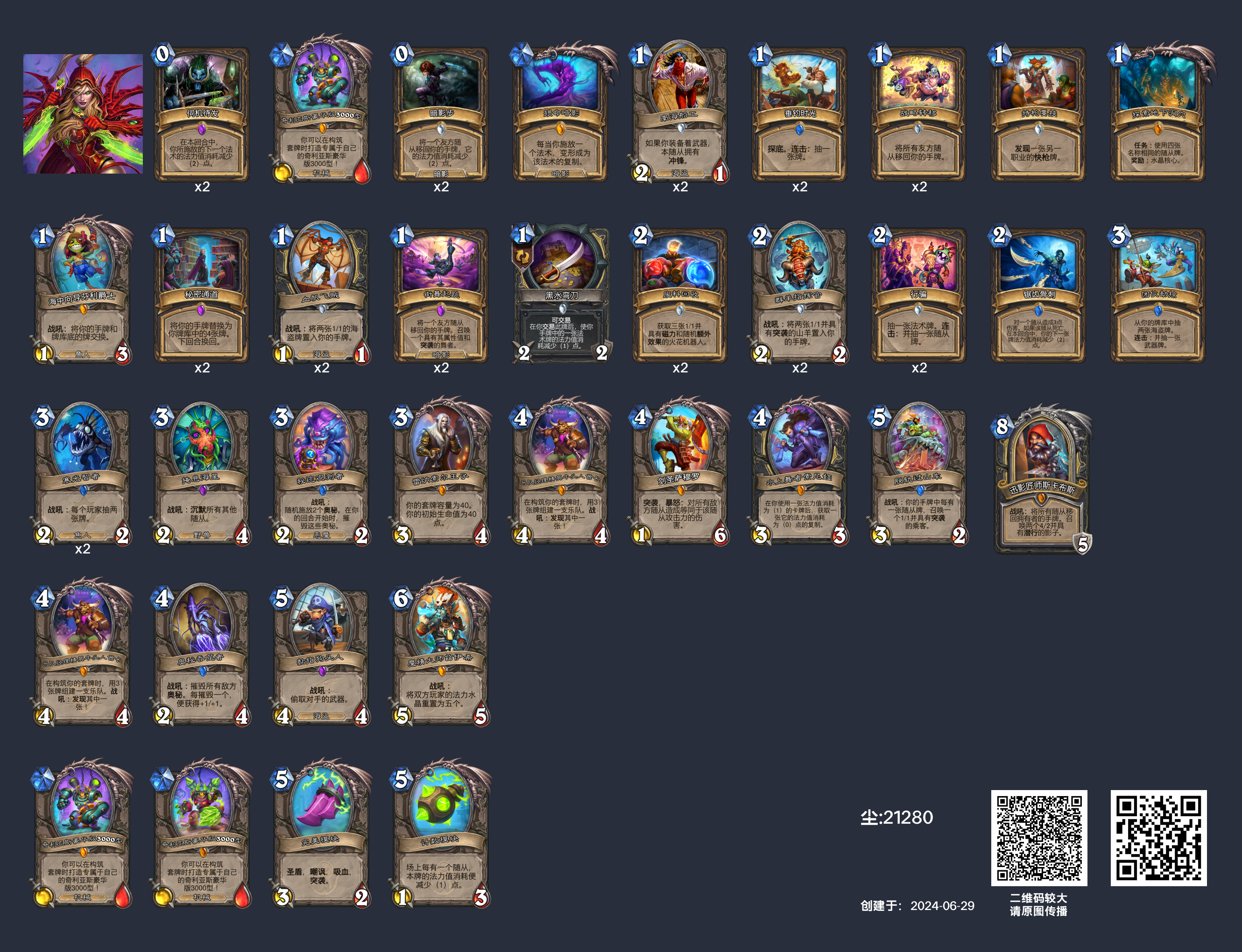这套牌是国服关服之前就已经组出来了,至今除了一张奇利亚斯以外其他牌还没别削弱过,未来最有可能被削的估计就是索尼娅了。当时卡组还不是很稳定,但是有一直坚持在玩这套牌,也是经过差不多两年版本的持续优化和迭代,近半年才熟练使用这套牌并且多次打上传说。本人水平有限,日常狂野传说探底玩家,能用自己组出来套牌上个传说我也就知足了,或许这套牌只是吃了狂野盗贼多形态的信息差红利,等熟悉套路以后只能算个贪B娱乐卡组了,最后希望地下洞穴永不塌方。