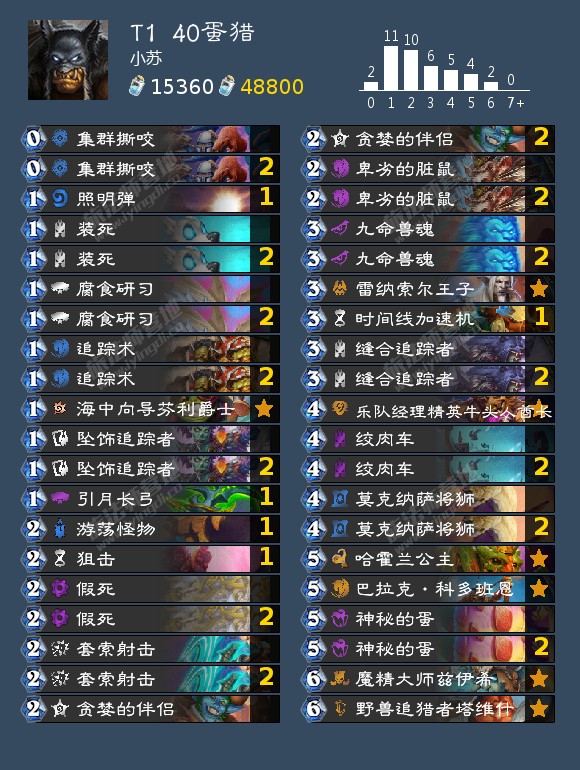 蛋猎是一套偏冷门的卡组形态,然而,参与本期环境报的专家们对这套卡组展示出了一致的认可,同时也有许多玩家使用蛋猎打到了高分段甚至是登顶,因此我们将其放在了T1上位。这套卡组依靠神秘的蛋和莫克纳萨将狮、哈霍兰公主的配合可以快速解场铺场,再配合苔原犀牛可以在一回合内打出极高的爆发。