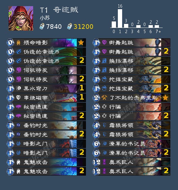目前环境中,能做到真正优开奇迹贼的卡组很少,而且天胡的奇迹贼是根本无法反制的。本期环境报提供三套奇迹贼构筑供大家尝试,第一套奇迹贼携带挖掘宝藏和奖品掠夺者,在内战中会更有优势,第二套卡包奇迹贼则是目前最流行的构筑,有黑曜石碎片和悦耳嘻哈的加持,在对阵慢速卡组时可以使用武器磨低对手的血量,再找机会用姐夫斩杀,第三套则是携带了霜狼将领和书记员的构筑。