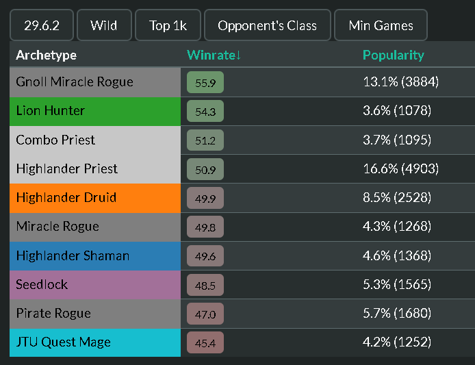 首先由于这是第一期环境报,因此还是需要特别说明,通常狂野环境只参考结算加成11星的数据,也就是传说前500左右。10星及以下的数据参考价值不大,参与本期环境报的玩家基本都可以以90%以上胜率速通低分段。如果你处在低分段,在环境报中抄一套T1卡组可以帮助你极速上分;如果仍有不同见解,我们欢迎理性的讨论。