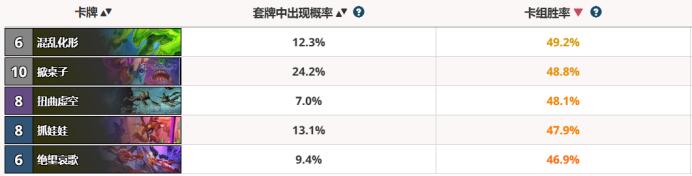 术士本版本投资大恶魔成功率极低,而且法师萨满横行,买一冻一、回荡混响、妖术等牌把亡语大哥克制的死死的,抓娃娃和哀歌不再强势。最好用的大法术是掀桌子,但是和哈加莎的契合度为0,10费1010才能使用一个a3,实在是对掀桌子强度的破坏。混乱化形虽然强度不错,但是削弱后让人不忍下手,一般是作为一张体系卡,有淤泥的情况下毁天灭地。