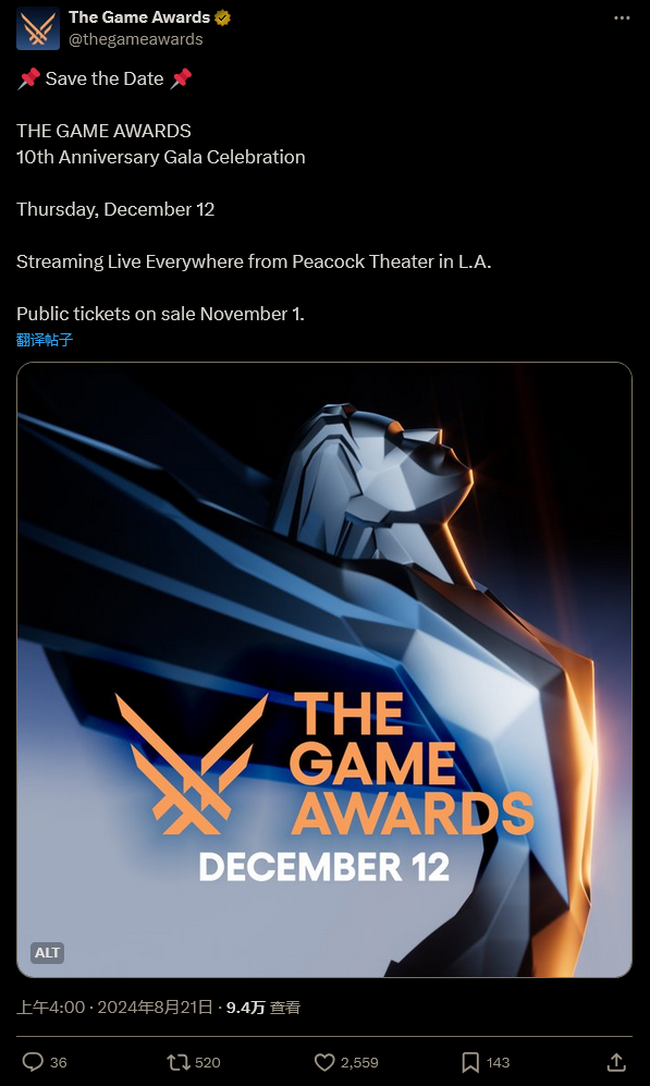 2024年TGA年度游戏大奖颁奖典礼定于12月12日举行