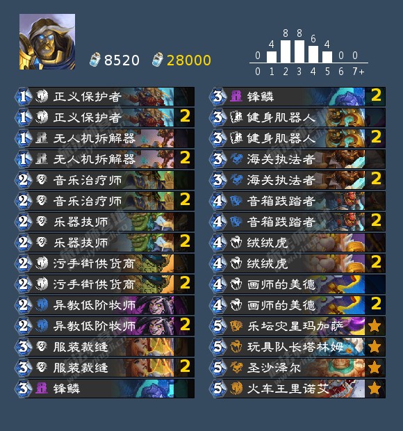 异教低阶牧师-音箱践踏者:由于当前环境有较多的法术依赖的otk卡组,法术针对还是有必要携带的。但是和自残术不同,我们费用不够宽松,携带两张音箱践踏者在卸牌上会有一定的压力;如果只是携带两张异教低阶牧师的话,又有压不住某些卡组启动的嫌疑,而且会丢失可交易的灵活性。因此,最终携带定为了两个各一张。