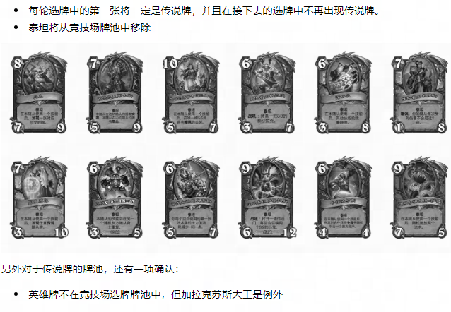 2023年11月7日,炉石新扩展《决战荒芜之地》上线。此次更新竞技场不仅轮换卡池,禁用泰坦,还直接重做了选牌机制,每轮选牌有且只有第一张牌必定是传说,后面29抓都不会再出现传说。
