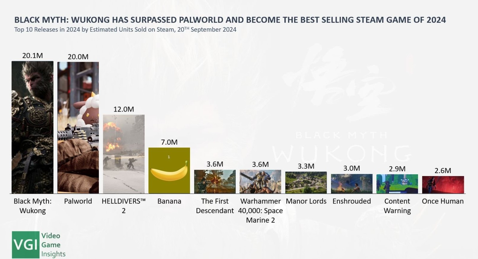 近日据VG Insights数据显示,《黑神话:悟空》销量2010万份,超越《幻兽帕鲁》销量2000万份,成为2024年Steam上最畅销的游戏。