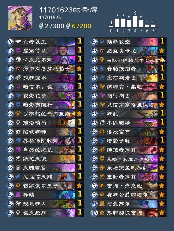 这套是我抄别人的,名字我忘了,评论区发出来。因为当初国庆白银黄金的时候,快攻不少,再加上暗影法术的限制,把原本卡组的545嘲讽换成一张噬灵疫病。想到啥写啥吧。。。