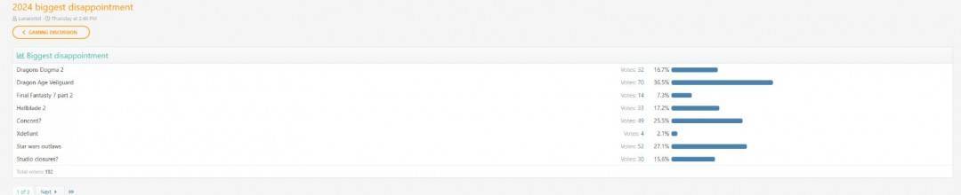 更能反应《龙腾世纪:影障守护者》对玩家伤害最深的莫过于最近的一次玩家投票,《龙腾世纪:影障守护者》成功击败《星鸣特工》、《星球大战:亡命之徒》成为2024年最令人失望游戏。