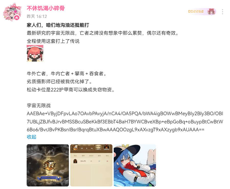 由于移动端的卡组讨论区没啥人力管理,乱打标签现象严重,故暂时停止经营,如果想更快看到高分卡组等等可以关注此营地账号,看时间随缘更新: