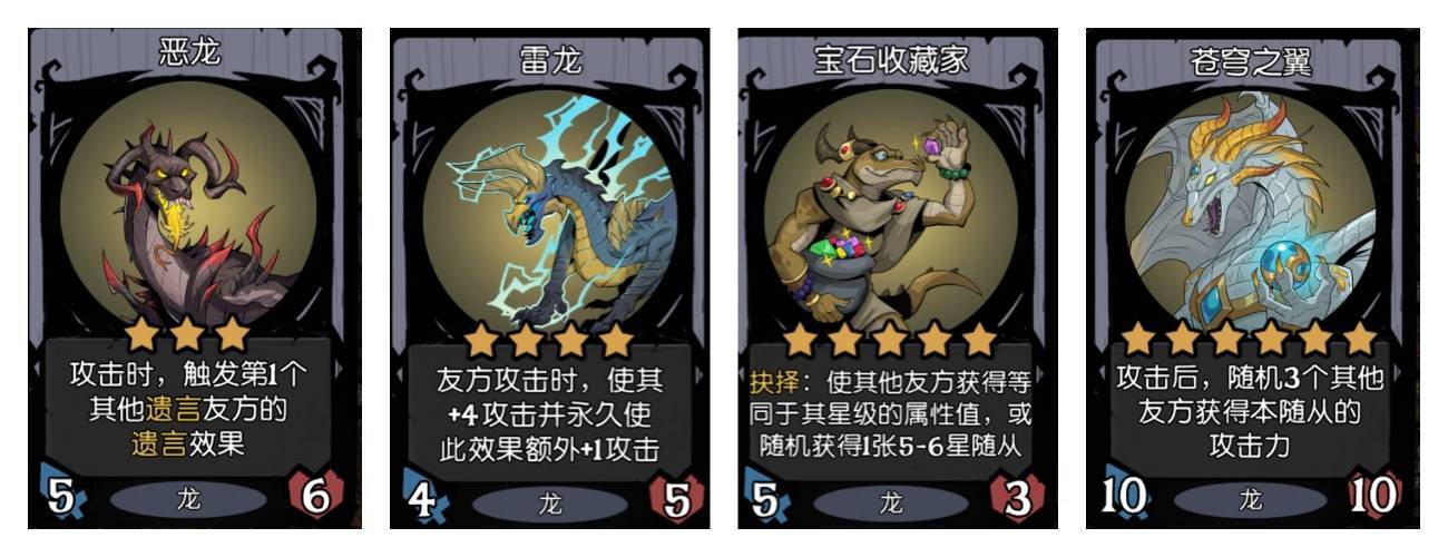 龙阵营一共新增了四个新随从,其中宝石收藏家同样也加入了标准模式。新增随从恶龙的效果是攻击时,可以触发第一个其他遗言随从的遗言效果。这张卡可以主动触发遗言效果,非常适合搭配独眼调查员这个英雄。目前镜极阁楼主流的刃角龙玩法就是以恶龙为核心来搭配阵容的。雷龙的效果是在友方攻击时使其获得+4攻击力被升级该效果。这张卡极度依赖攻击频率升级效果且buff效果无法保存。目前的玩法是搭配神射手和咆哮巨龙等来进行先手龙阵容中期的过渡。苍穹之翼的效果是攻击时会随机让3个其他友方获得本随从的攻击力。这张卡可以作为后期大核来重点发育,搭配咆哮巨龙和贪食之龙就可以吸收其传递的攻击力,在镜极阁楼目前主流的后期龙阵容已经顶替掉灾厄之龙的先攻地位。