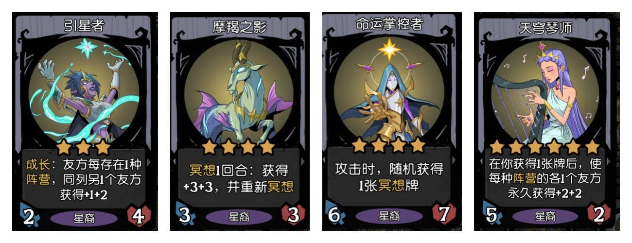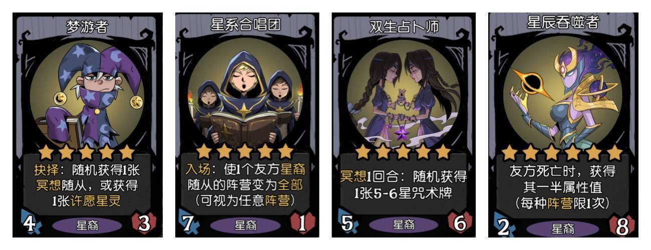 星裔阵营一共新增了四个新随从,其中双生占卜师、星系合唱团在标准模式也同样上线。新增随从梦游者效果是抉择随机获得1张冥想随从或者获得1张许愿星灵。这张随从是一张极为宝贵且很灵活的资源牌,搭配先王的怨念你既可以选择刷冥想牌又可以选择获得许愿星灵,你既可以选择进行冥想倒转的玩法也可以利用这张卡来搭配扳手倒转。星辰吞噬者的效果是在友方死亡时获得其一般属性值,每个阵营仅限1次。这张卡可以看作是一张即插即用的后期随从,不需要发育保证其不会被aoe伤害打死即可。在后期我们可以选择在手里囤积一张,可以有效的提升我们后期的阵容战力上限。