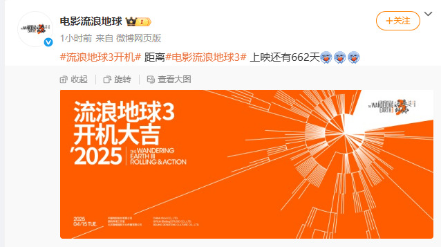 4月15日,电影《流浪地球》官方微博发文官宣:流浪地球3开机,距离电影流浪地球3上映还有662天 。