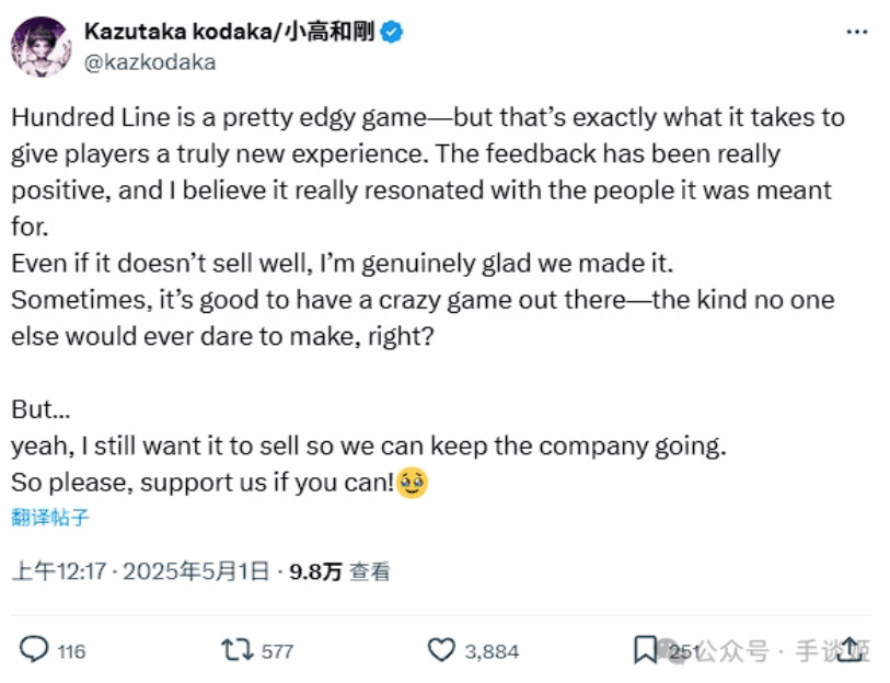 但小高和刚在X上称,希望能卖得更好,否则公司怕是不妙了。以前他在接受采访时也谈到过,自己公司是靠贷款硬扛着制作本作的,可见有相当大的资金压力。