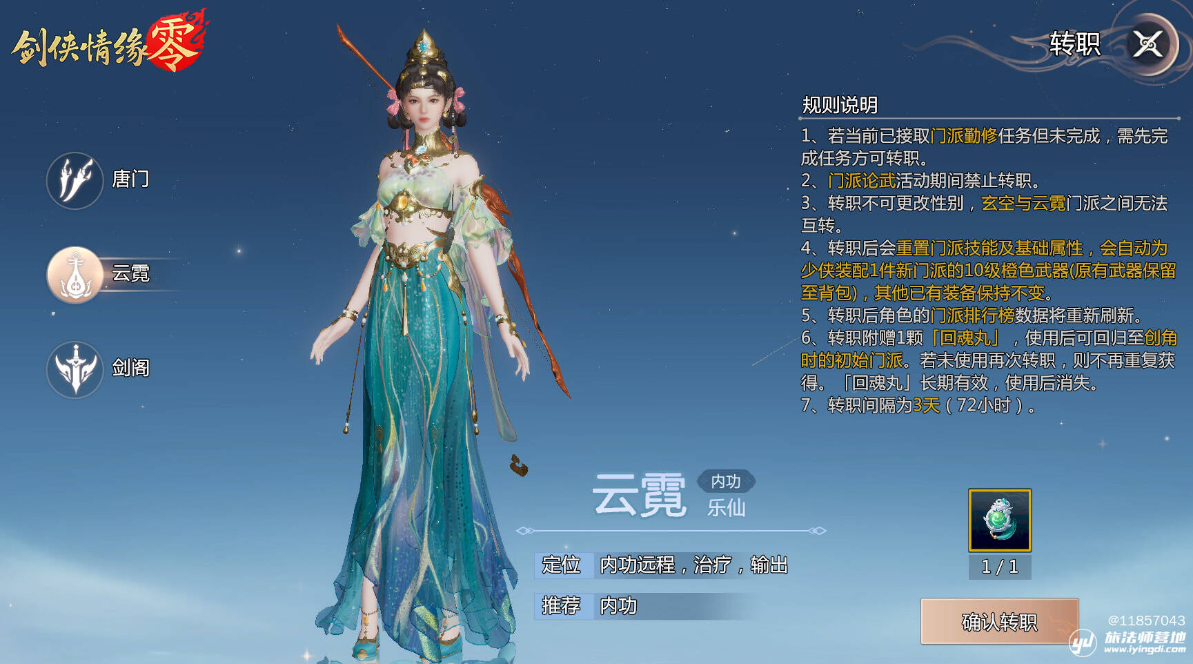 转职流程十分简单,玩家只需购买并使用"转职令",即可轻松转投心仪门派。成功转职后,系统会自动重置技能与基础属性,并为玩家配备新门派的高品质武器,同时也保留原有装备。需要注意的是,转职不可更改性别,部分门派之间无法互转。如果转职完后悔了也没关系,转职还贴心地附赠一颗"回魂丸",使用后即可“回档”到初始门派状态。