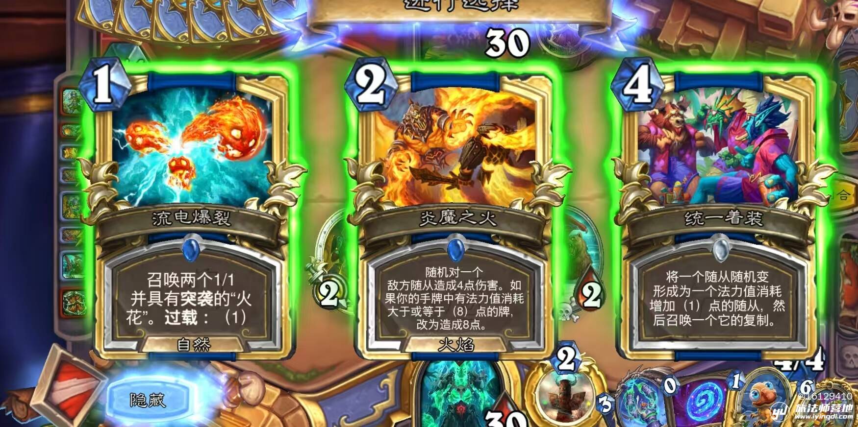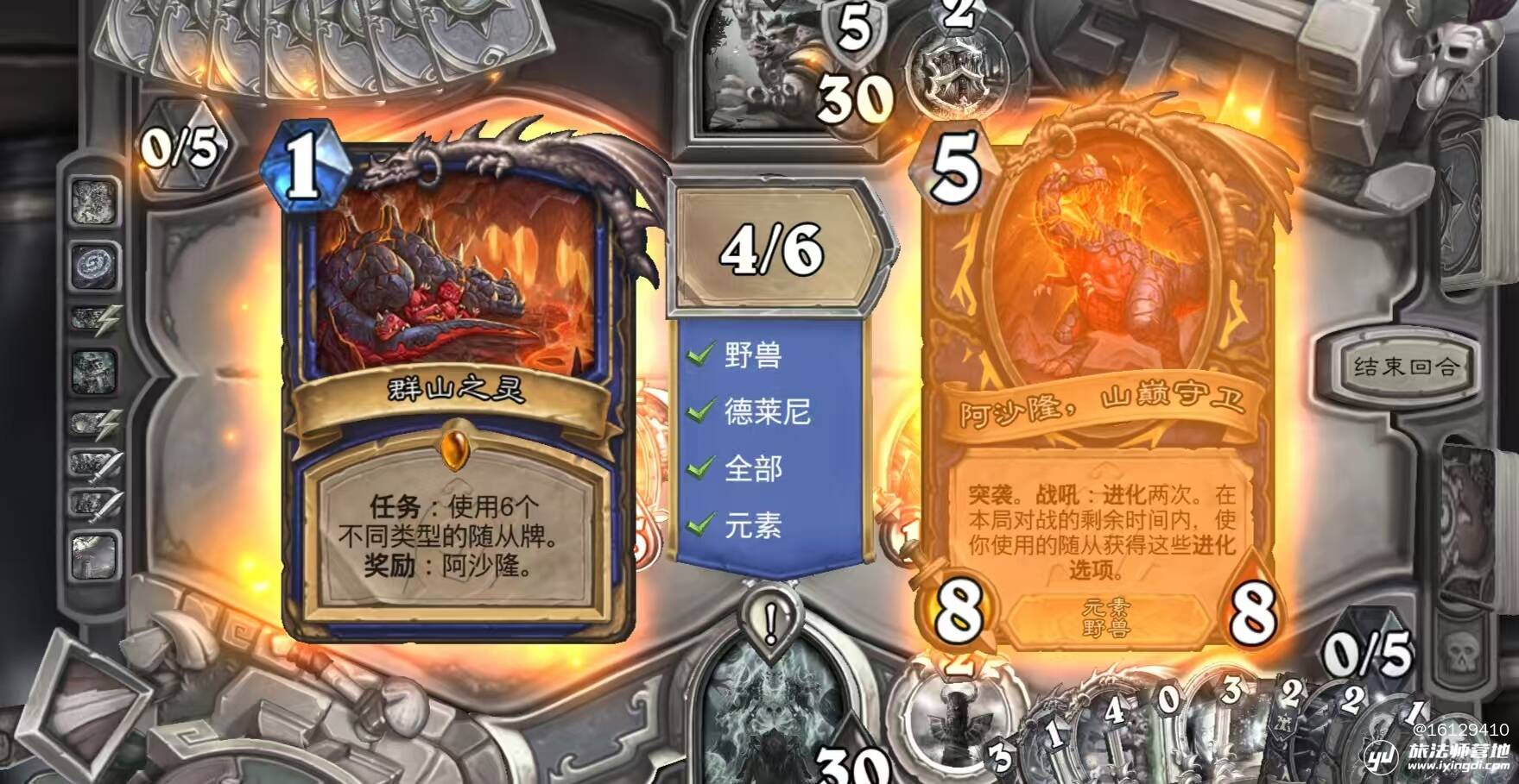 在面对这类场合,应当在5~6费尽可能的完成任务。由于任务萨1费空过,加上卡组内随从质量有限,在2~4费期间会损失一定量的场面(当然,如果选择快速完成任务的话,一地的杂毛铺场还是会对对手有压制力的)。在考虑随从尽可能站场交换,保护血量的考虑下,个人认为最佳的任务奖励选择是: