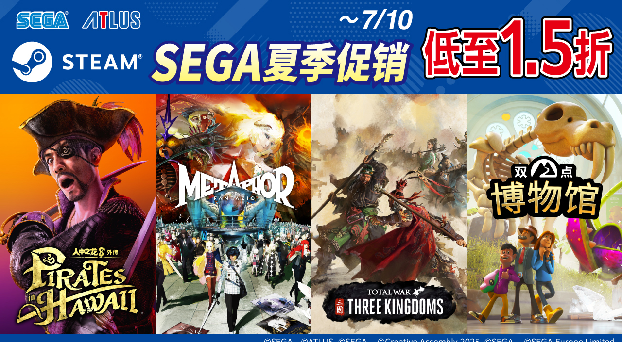 世嘉宣布,Steam“Publisher Sale”活动开跑,Steam部分在售世嘉与ATLUS的游戏推出限时优惠。本活动将于2025年9月4日结束。