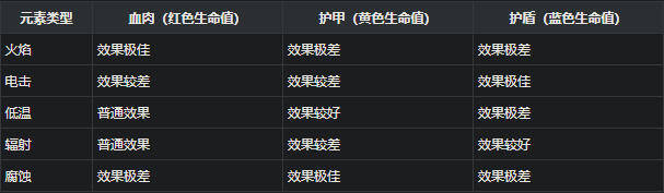 元素弱点除了自身特效外,还与敌人对特定元素伤害类型的弱点相关,这取决于哪种生命条类型(血肉/护甲/护盾)会受到该元素的额外伤害。