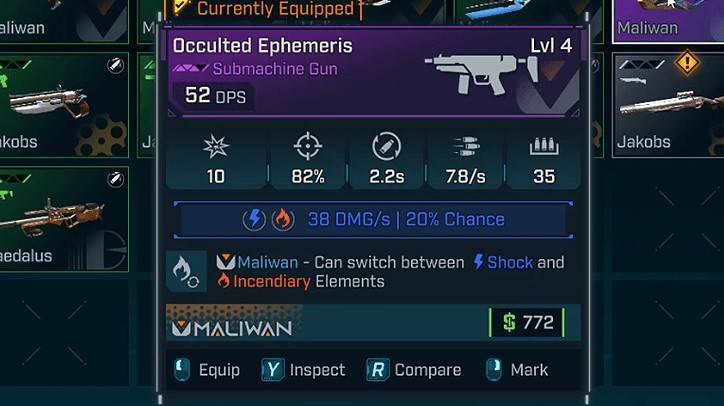 马里旺武器尤其倾向于提供可切换元素类型作为其厂商部件特性。如上图所示的火焰与电击双属性SMG,允许您在元素间切换。