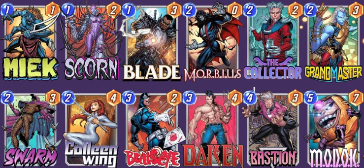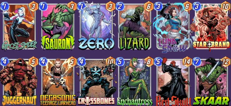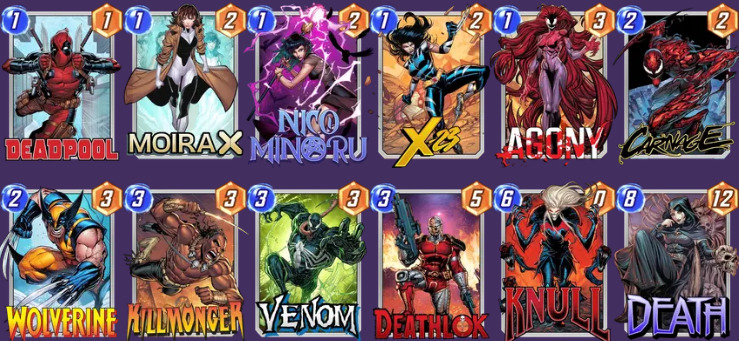 【莫伊拉X】在短暂的技术调整后又回到了主流构筑,始终没人会拒绝多一个【毒液】或者【死亡女神】,甚至【莫伊拉X】自己左脚踩右脚的超绝核combo。【齐尔蒙格】的大幅削弱给予了摧毁卡组不少影响,但奈何该带还是得带,其作为不可多得的低费摧毁组件依旧是玩家启动【死侍】和【X-23】的关键手段。目前环境中【星尘】正作为热门控制组件频繁出没,各位摧毁玩家在点snap时可能要多留些心眼了。
