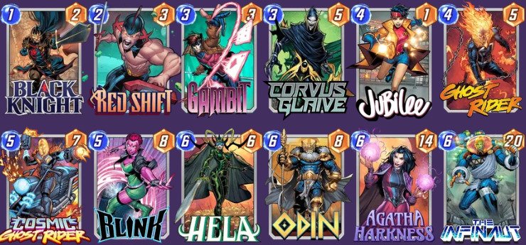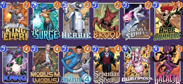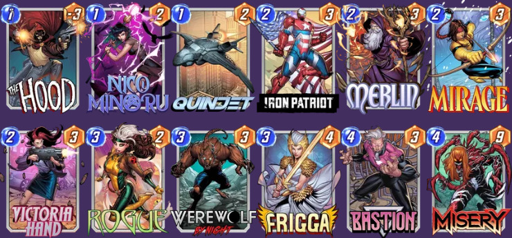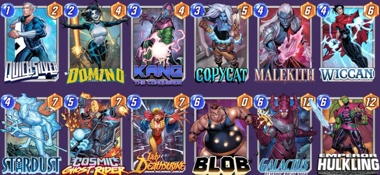 【康】的完全重做掀起了一阵构筑更新热潮,仅凭一张卡就治好了不少老玩家的“电子**”称起为继【阿里瑟姆】后Marvel Snap最有趣的5池卡一点也不为过。【康】的全新效果提供了另类的3费曲线补充手段,这为【巫术】卡组打开了新思路,即只带【快银】+【多米诺】+【康】度过前期,把卡组曲线尽量后移,以保证打出【巫术】后的单卡质量。这样的好处在于能携带更多具备一锤定音性质的后期斩杀组件,但【康】的洗牌机制无疑会降低【巫术】的上手率,所以是否合理还有待继续观察,本期周报更多参考流行度和新构筑的选择。但鉴于【康】本身也能作为snap关键点,笔者还是很推荐大家尝试的,毕竟随机性也是电子卡牌游戏的一大魅力所在。