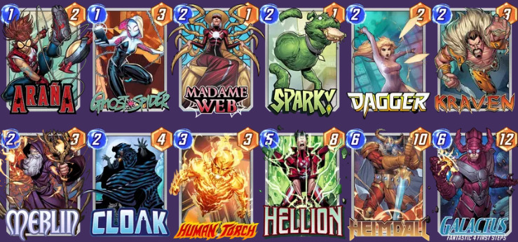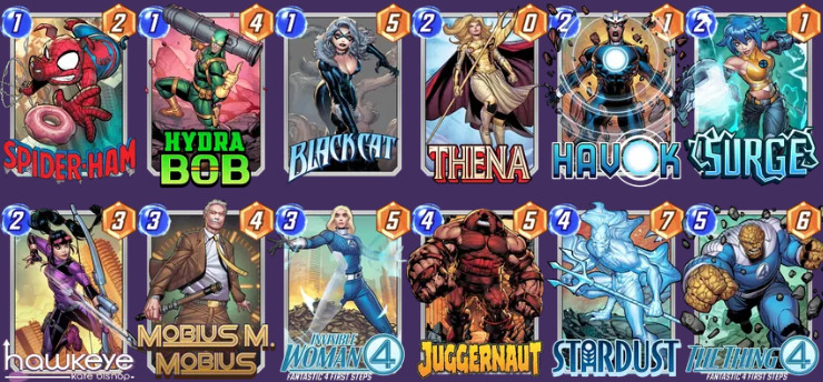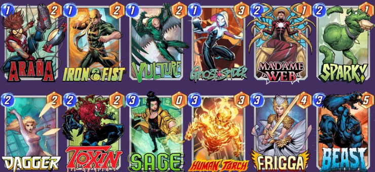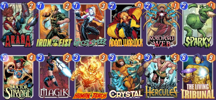 在舍弃掉【神奇先生FS】和【神奇飞车】后,“回合结束”体系的轮椅属性并没有明显减少,反而是逐渐又回到了中速卡组“扛把子”的地位。亮点在于空出两个卡位后构筑可以自由携带具备泛用性的控制组件——尤其是【M.M.M.】和【星尘】,能在设计师有意推崇自闭卡组的当前环境下关住很多防御性不突出的体系;【蜘猪侠】同样也是对付自闭卡组的意外好手,恰当时候能砸中对手关键手牌便能狠狠点snap。
