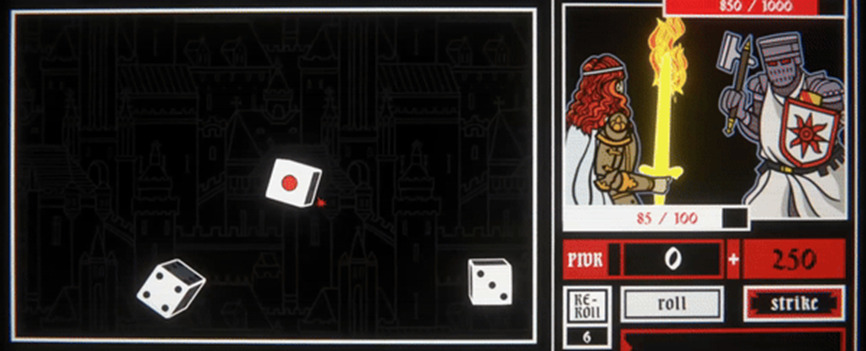 你将通过投掷骰子来积累点数,特殊点点数排布将激发出强大力量。通过多次投掷出合适的点数,你将逐渐积累力量打出数值巨大的伤害。但要小心,投掷的次数越多,风险也越大——只要有一次失败的投掷(Farkle),你将失去所有积攒的力量!愿王的圣剑给予你冒险的勇气,激发出你最强的力量。