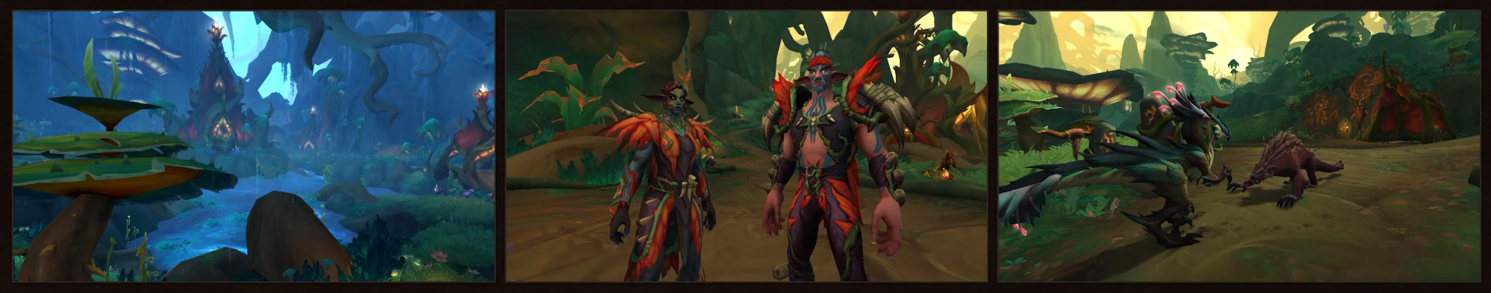 你的旅程将从永歌森林开始,离开这片初始区域后,故事的发展轨迹将由你自行决定。三条道路任你选择,顺序不限:深入祖阿曼这古老的巨魔王国,探寻哈籁恩达尔那盘根错节的隐秘根系,或是陪伴阿拉托尔踏上旅程,让他更深入地理解自己与家人和圣光的关系。