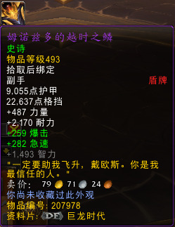 最后,戴欧斯会掉落一件装备,叫“姆诺兹多的越时之鳞”,上面有这么一句话。