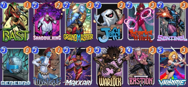 不怎么新的新卡组,其实是在【薇薇·幻视】初登场时就出现的构筑,只是借助本次平衡补丁的加强平添了不少人气,因此综合强度定在第二梯队后半程。卡组强度基本围绕【跳跃者巴托克】【嚎叫】【克莱文】三卡展开,【二代美队】作为移动体系的绝佳拍档基本也属于必备,3费前能否拍下其中两位决定了整场对局的走向,否则就即将面临拿着几个移动组件瞎转悠的尴尬局面,因此这套卡组总给人一种不知道在干嘛的游戏体验,但大数据上看其实还好。【薇薇·幻视】在其中起到补充战力和移动次数的作用,作为辅助展开手段不算核心,可考虑换成【九头蛇特工鲍勃】等其他优质移动单卡。