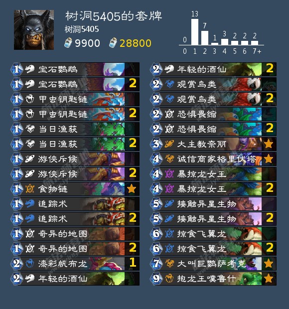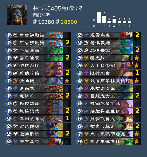但在实际对局过程中常常会面对找不到1、3、5、7食物链,开出任务没有斥候,暴龙王开的不理想,蛆dk血线过高触发不了抱龙王,暴龙王一波压不死等后期乏力的情况。受星界法启发,带上了两张小熊猫,一方面可以回手任务,一方面可以回手猪神打出超高OTK,经过调整胜率现在稳定在60%左右,下面是卡组: