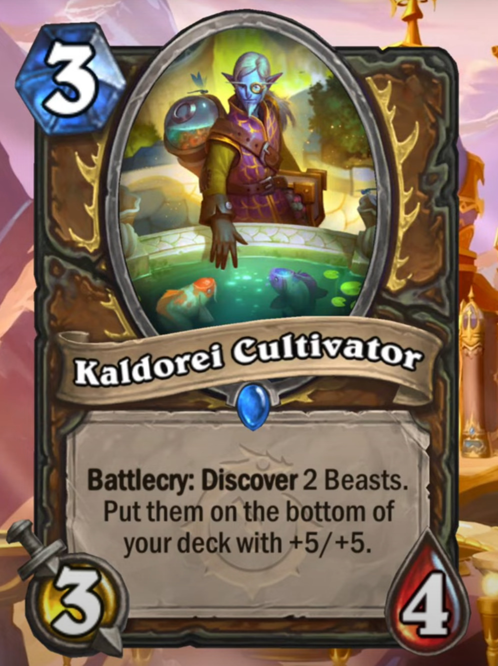 战吼:发现两张野兽牌。使其获得+5/+5并置于你的牌库底。
