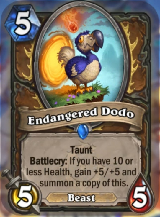 嘲讽。战吼:如果你的生命值小于或等于10点,获得+5/+5并召唤一个本随从的复制。