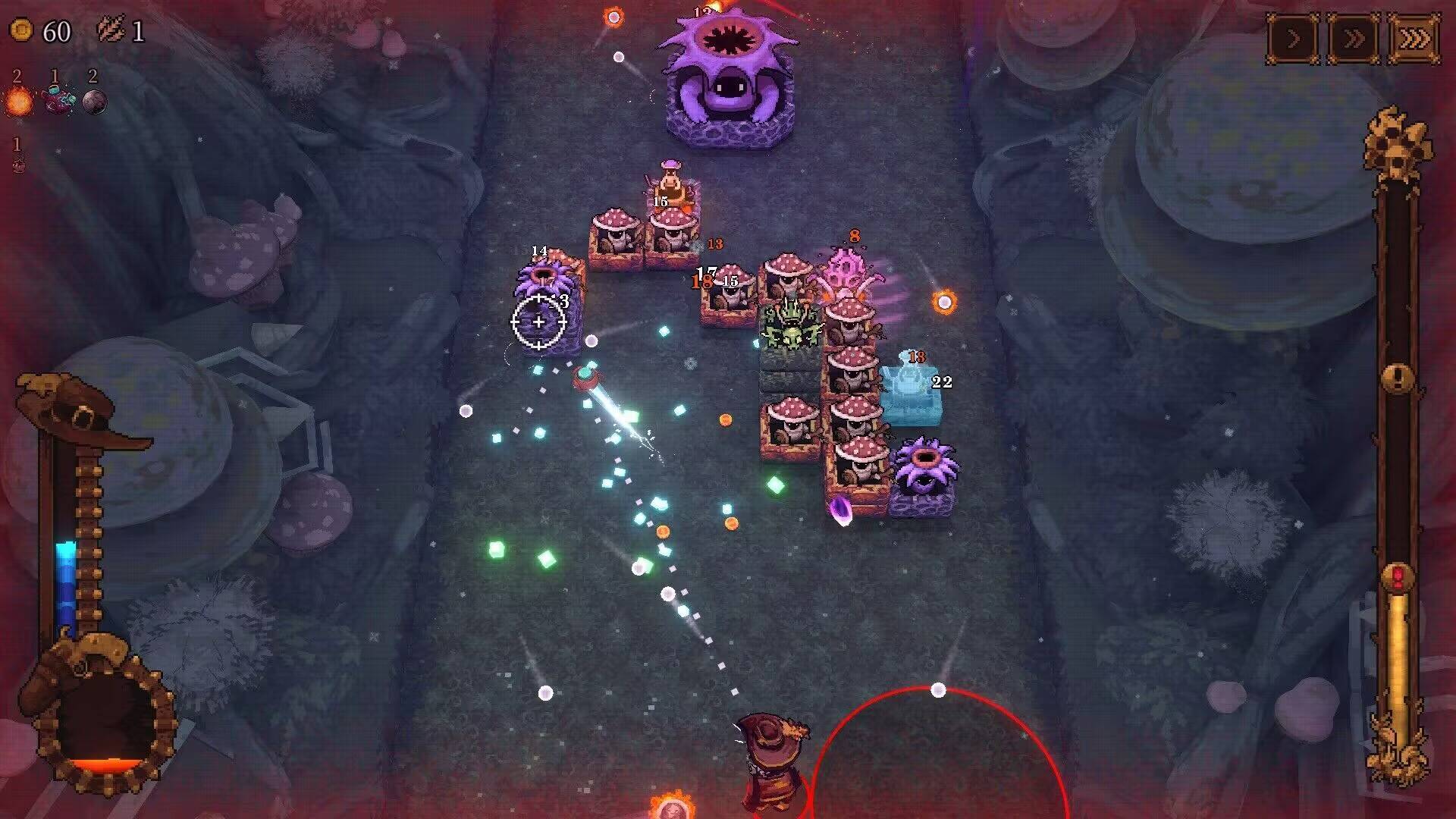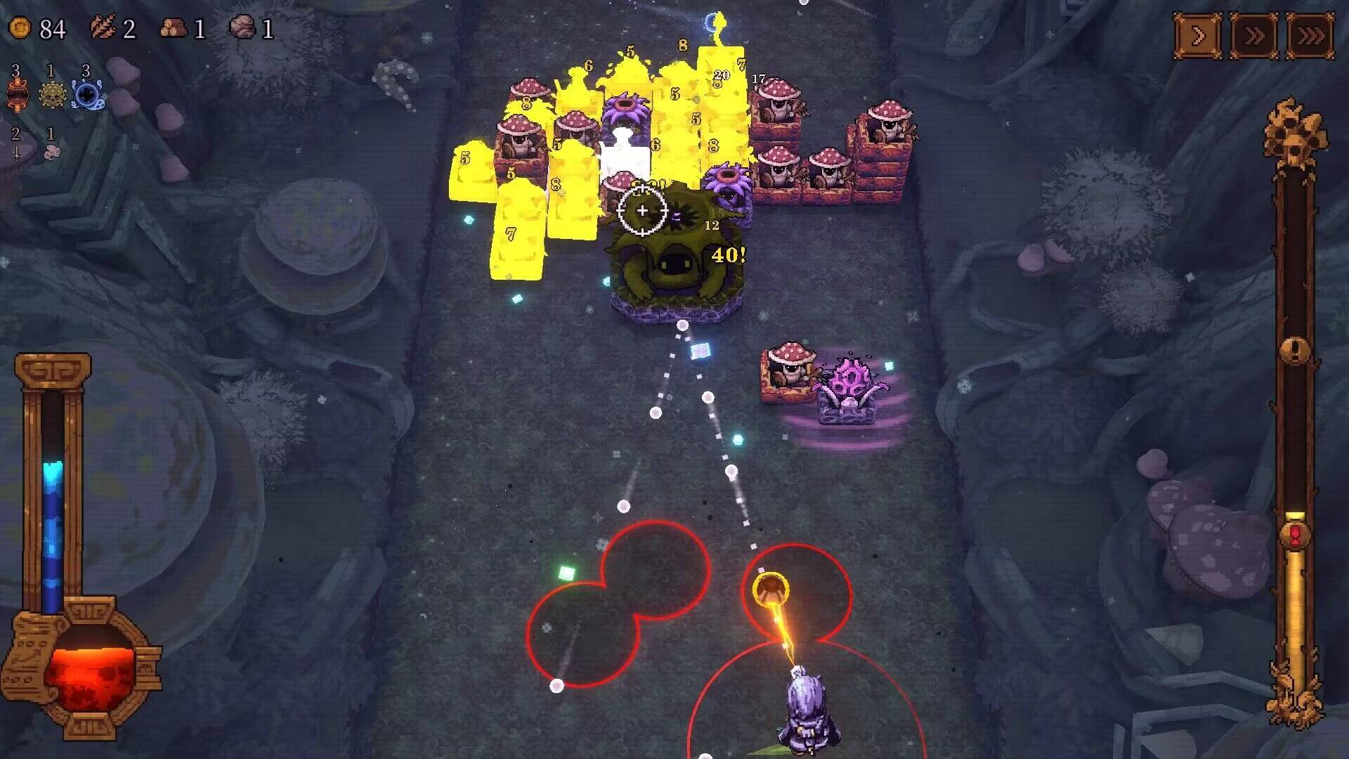 游戏是一款肉鸽弹幕射击游戏,发射出去的弹珠不断反弹,撞击怪物,对怪物造成伤害,击败怪物达成通关的条件。局外则是需要我们建造经济建筑后采集素材,建造可以在局内提升角色属性,解锁新人物的住宅。