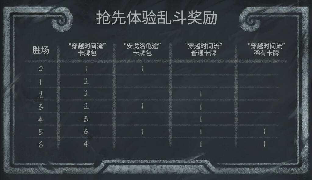 按照新例,每逢拓展包预装(.0补丁上线时)都会有抢先体验乱斗,所有玩家均可将预购、社区日、赛季奖励等获得的新版本卡包提前开包,并在特殊乱斗中提前组牌使用。这种乱斗首轮免费,之后门票需2张旅店通票/300金币,奖励更多新版本卡包等奖励,是炉石最新的回收金币和刺激预购的做法,但反正也确实比以往其他做法更好。