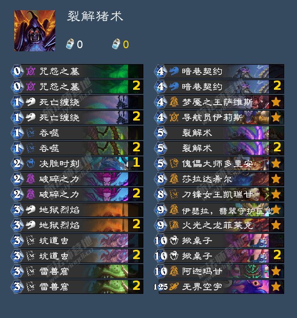 以新卡裂解术为核心,构筑的新版本傀儡猪术。高费卡除了像以前一样用傀儡大师多里安抽上来以外,还能用裂解术减费,能减到火光之龙菲莱克或者阿迦玛甘的话完全有能力把前面亏的场面打回来,只不过爆发效果想必是不会有过去的猪术那么好的,能有昔日荣光的几成水平需要打一个问号,但是这确实是少数能利用裂解术的地方了。为了能够让前期不那么空过,携带了上一次出场大概要追溯到威兹班版本的暗巷契约+决胜时刻(然而后者大概率要被优化掉)。提一嘴无界空宇,虽然看着是为了凑导航员伊利斯的费用,但是如果减费较多的话也可以直接裂解术劈了当大解用,还能留一个在手里,加倍减费的话效率还是很恐怖的。