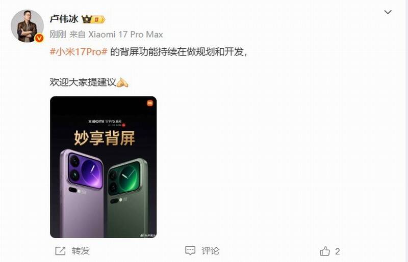 今天,小米集团合伙人、总裁卢伟冰明确表示,针对小米17 Pro背屏的新功能正持续推进规划与开发。