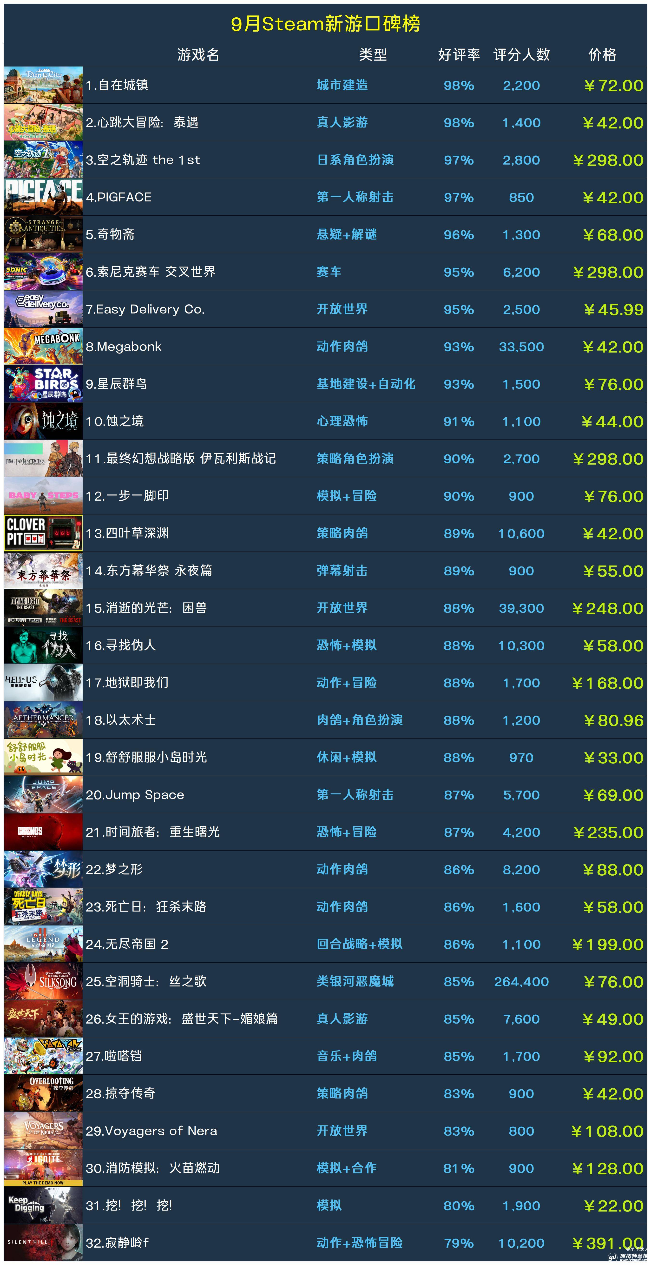 仅选取评价数≥800,且好评率≥80%,上月发售的新游戏(不包含EA转正的游戏)