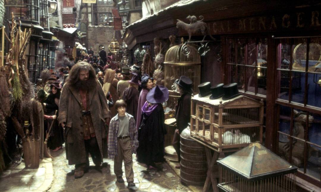 在克里斯·哥伦布执导的首部《哈利波特》电影中,对角巷也曾登场,被设定为巫师们采购魔药、魔法物品与学习用品的集市街区。