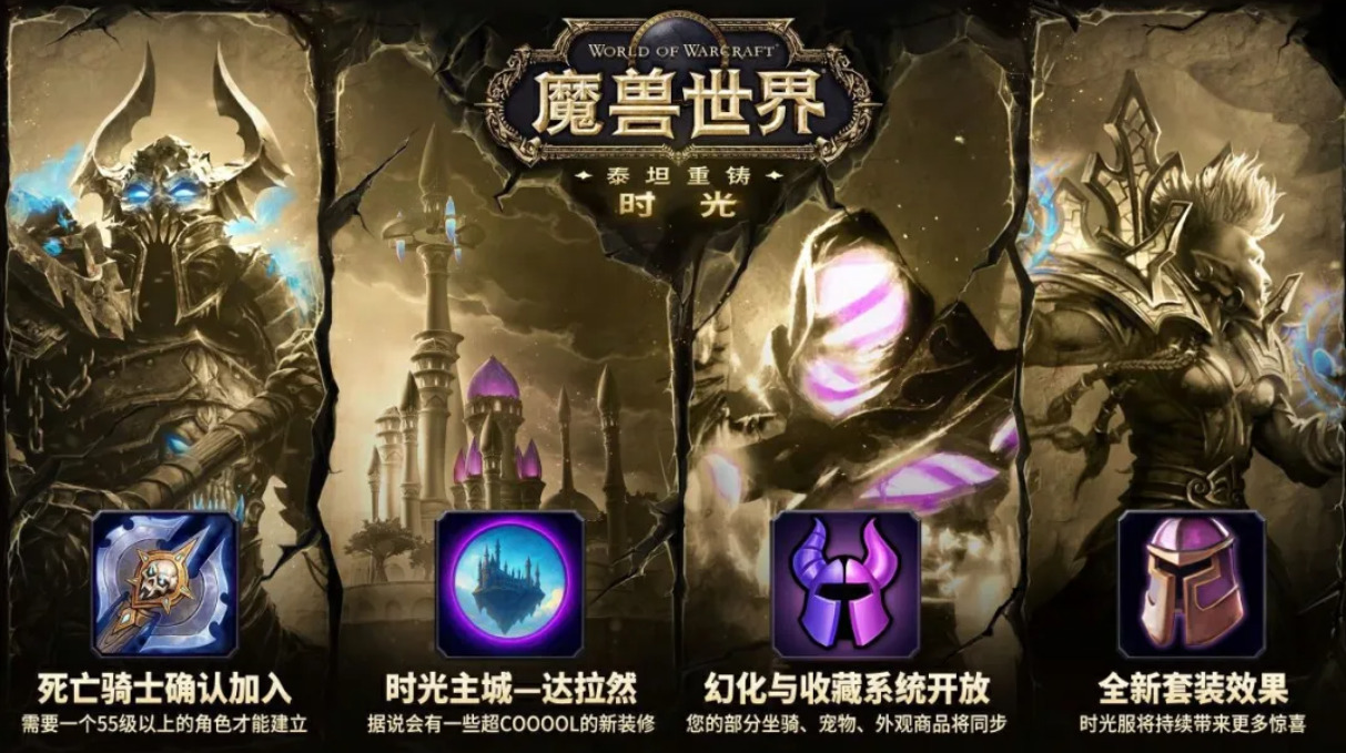 死亡骑士确认加入泰坦重铸服务器「时光」,你需要拥有一个55级的角色后才可以创建死亡骑士职业。