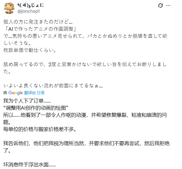 近日,日本资深动画师Joni在社交媒体披露,其收到一份要求"修正AI生成动画"的廉价委托,引发业内对动画产业生态的广泛担忧。这位同时担任角色设计师与前动画指导的专业人士强调,此类现象折射出行业正面临廉价外包与AI技术滥用的双重冲击。