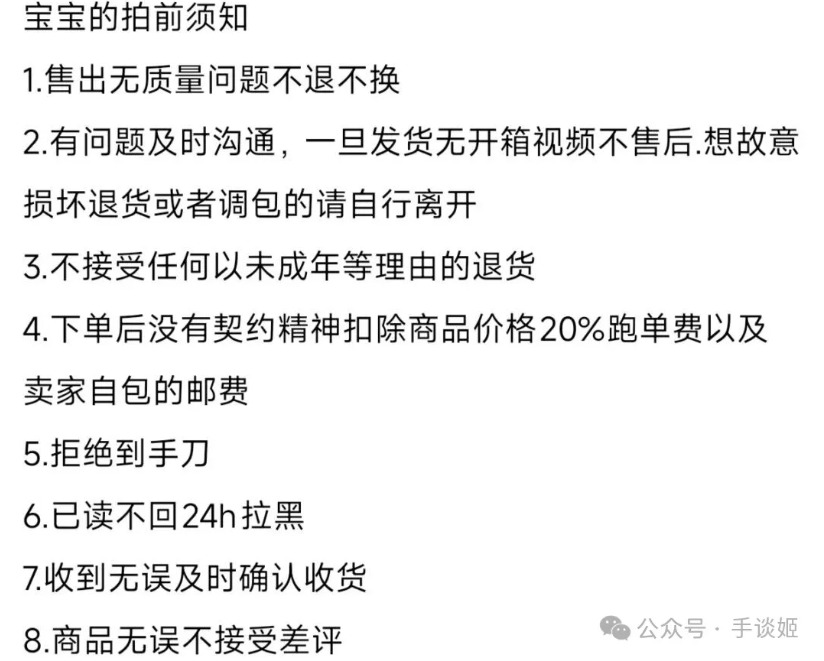 在看到社交媒体上各个新闻媒体、博主激情批判的同时,姬忍不住抬头再看了看上面那些被无端辱骂、按头退款,以至于不得不思考严格反制措施的卖家们。