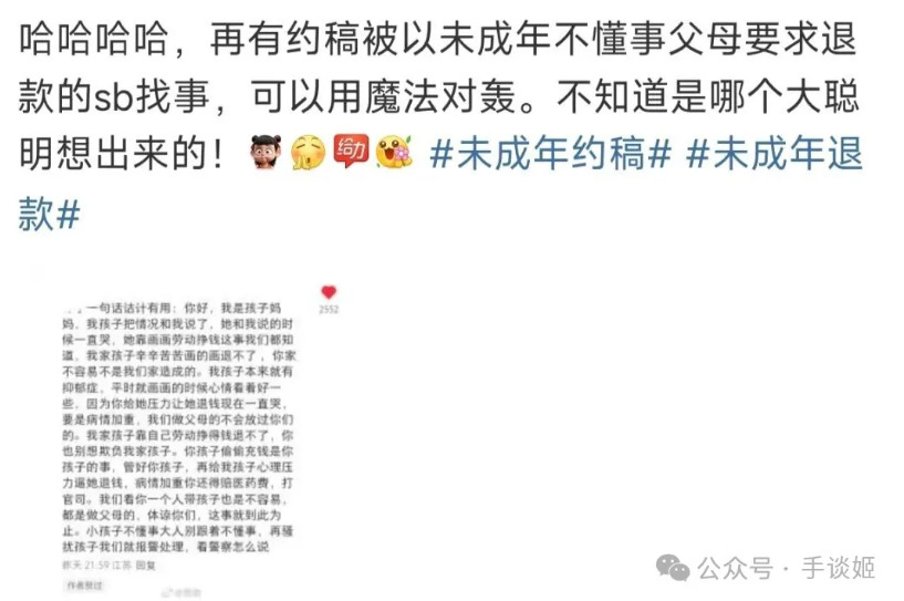 实际上,未成年退款并不是什么少见的事情。除了各大游戏厂商经常遭遇小登退款外,各个二手交易平台和约稿软件也没少出现这种奇葩——你别问家长(也可能并非家长)在干什么,反正他们总能找到各种各样的理由为自己开脱责任,然后急赤白脸要求退款,否则就各种辱骂投诉举报送律师函,恨不得把你全家生吞活剥。