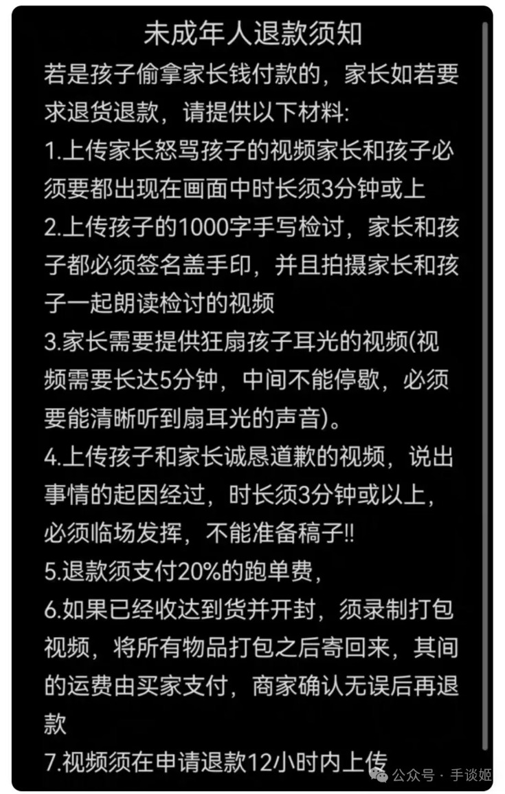 但是,卖家们的心情就应该被完全忽视吗?在群情激奋指责卖家设立严格规则的同时,是不是也应该指责一下教育严重缺位的家长和伪装成家长要求退款的骗子呢?