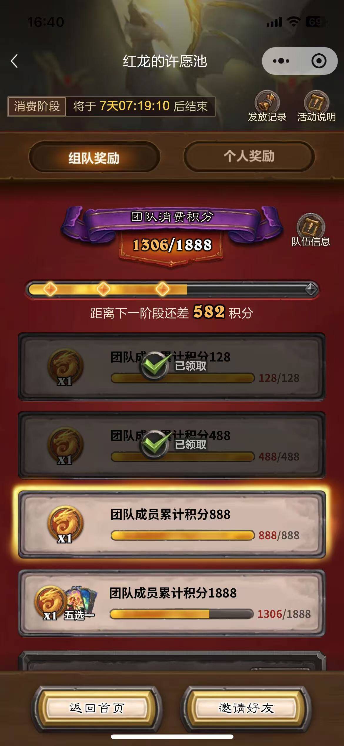 红龙活动,我的队伍就我一个人,目前积分1306。手贱把前两个红龙币点掉了。不介意的来。还有四个位置