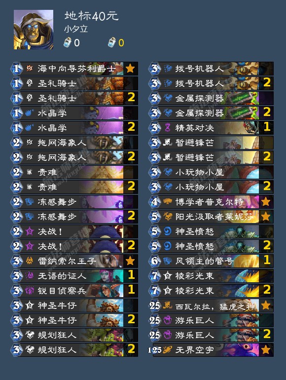 从构筑就可以看出,这套并不是如同30元一样去比较极端的追求马速,追求125,而是加入了很多抗快组件(露米娅,756,精英对决等等)使得在对战弃牌术海盗瞎等对局中会比较舒适。
