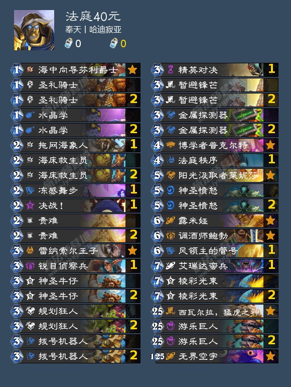 同时舍弃了节奏拖沓,收益也不大的小玩物小屋,因为作为一个本身就3费曲线比较臃肿的卡组,地标作为3费曲线,对比其他优秀的3是属于不合格的。决战只带了一张,因为40构筑导致决棱配合率降低,而且法庭秩序芬利后会干扰我们过滤2费牌。卡组没有携带无语的证人,并不是放弃打法师了,而是我们可以靠蹭血之后砸25压低血量,刀和棱彩补伤害破冰,最后双责难或者游客责难冻步完成终结。
