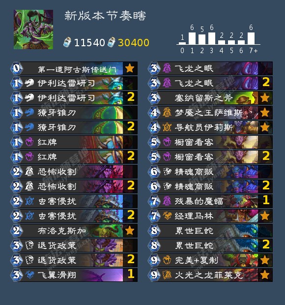 前中期为魔种+巨蛇的节奏,中后期还是靠商贩魔蝠的亡语套实现费用“滚雪球”,奇闻冲锋算是个“软斩杀手段”,不必将其视作核心