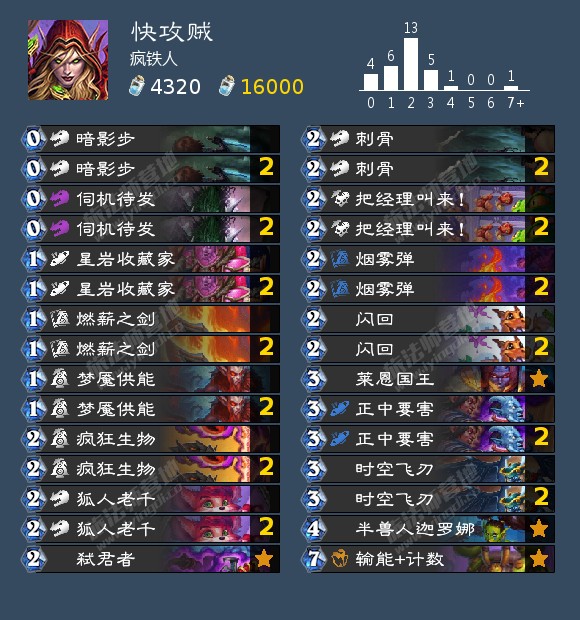 最下方有战绩。我只打了5把,分别赢了「撕裂术」、「节奏49贼」、「任务防战」、「任务术」和「假人战」,刚好是天梯最活跃的几套卡组。(在我的想象中打DK应该是劣势,但我没碰到)鉴于样本量过低,所以这是一篇抛砖引玉的帖子,还望各路大神对卡组加以优化。这套快攻贼的主要思路就是开局留「伺机待发」,其他部分和别的快攻差不多。缺点在于几乎没有过牌,因为这卡组的每一回合都要做足事情,所以很难给过牌留出卡位和节奏回合,比较拼胡。但很容易1费就能做出5、6攻的场面。这是卡组代码:AAECAZrxBgTHpAaGqAeHqAeIqAcN9p8E958EvZ4GjNYG6uUG8+YGtfoGkIMHv4cHwYcH5qMHjK0H2a8HAAED87MGx6QG9rMGx6QG6N4Gx6QGAAA=